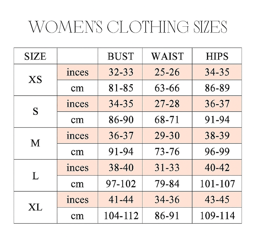 WOMEN CLOTHING SIZES AND COLOR CHART
